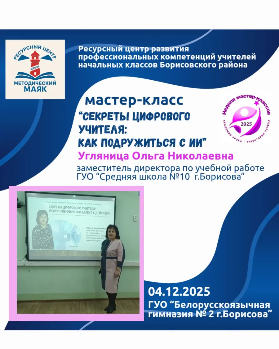 · Ольга Николаевна Угляница (СШ №10) — «Секреты цифрового учителя: как подружиться с ИИ». Мастер-класс показал, как современные цифровые инструменты и искусственный интеллект могут стать помощниками учителя в подготовке и проведении уроков.