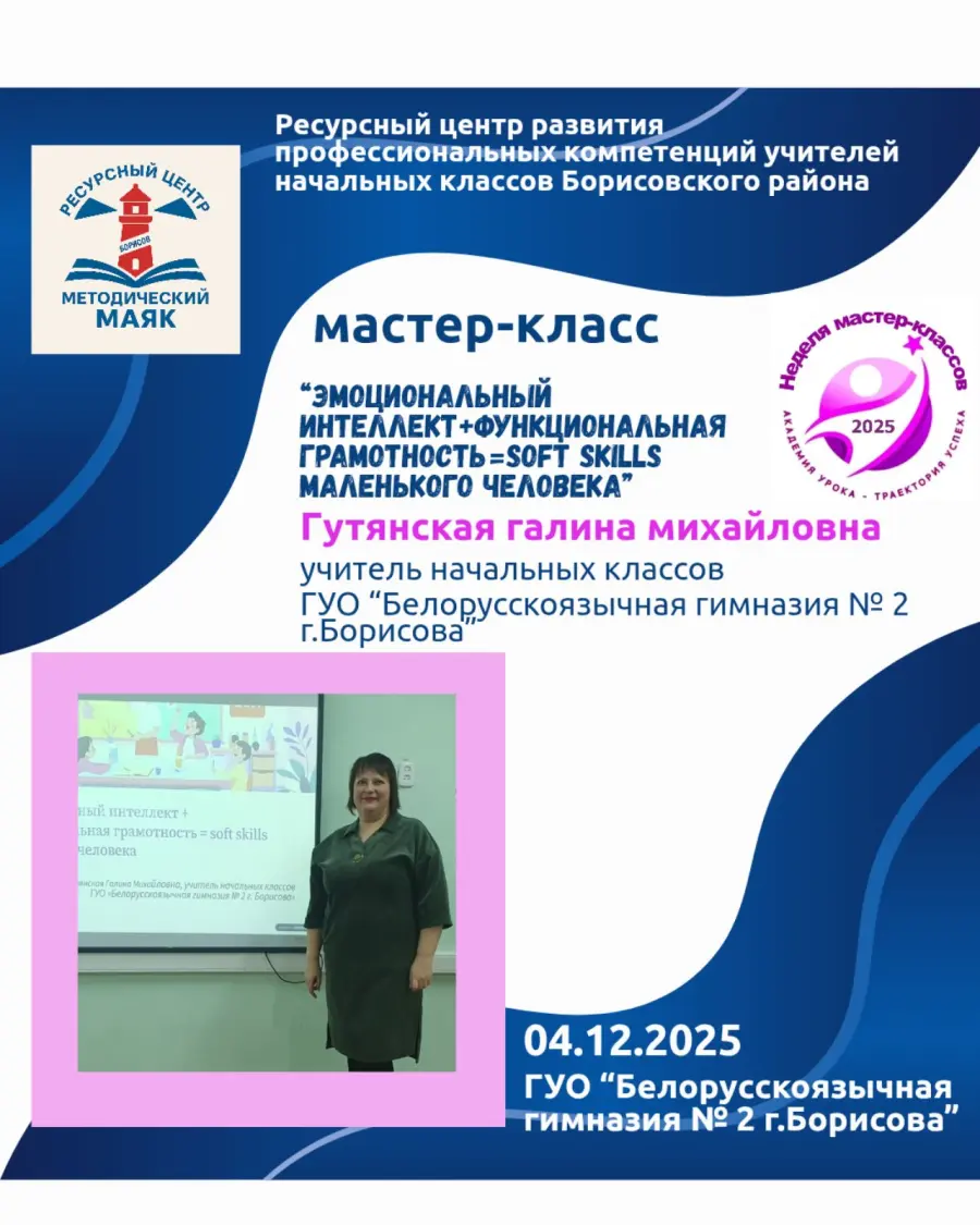 4 декабря методическая неделя вышла сразу на две площадки — Белорусскоязычную гимназию №2 и Гимназию №3 г. Борисова. День получился насыщенным и разнообразным: педагоги обсуждали развитие эмоционального интеллекта, геймификацию уроков, цифровые инструменты, интеграцию знаний и формирование навыков будущего.