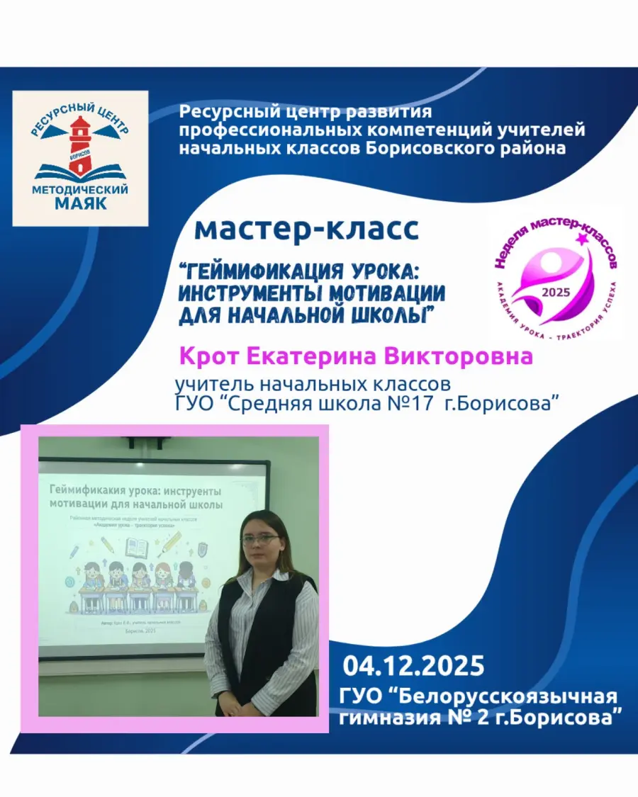 · Екатерина Викторовна Крот (СШ №17) — «Геймификация урока: инструменты мотивации для начальной школы». Участники познакомились с практическими приёмами, которые превращают урок в игру и помогают удерживать внимание учеников.