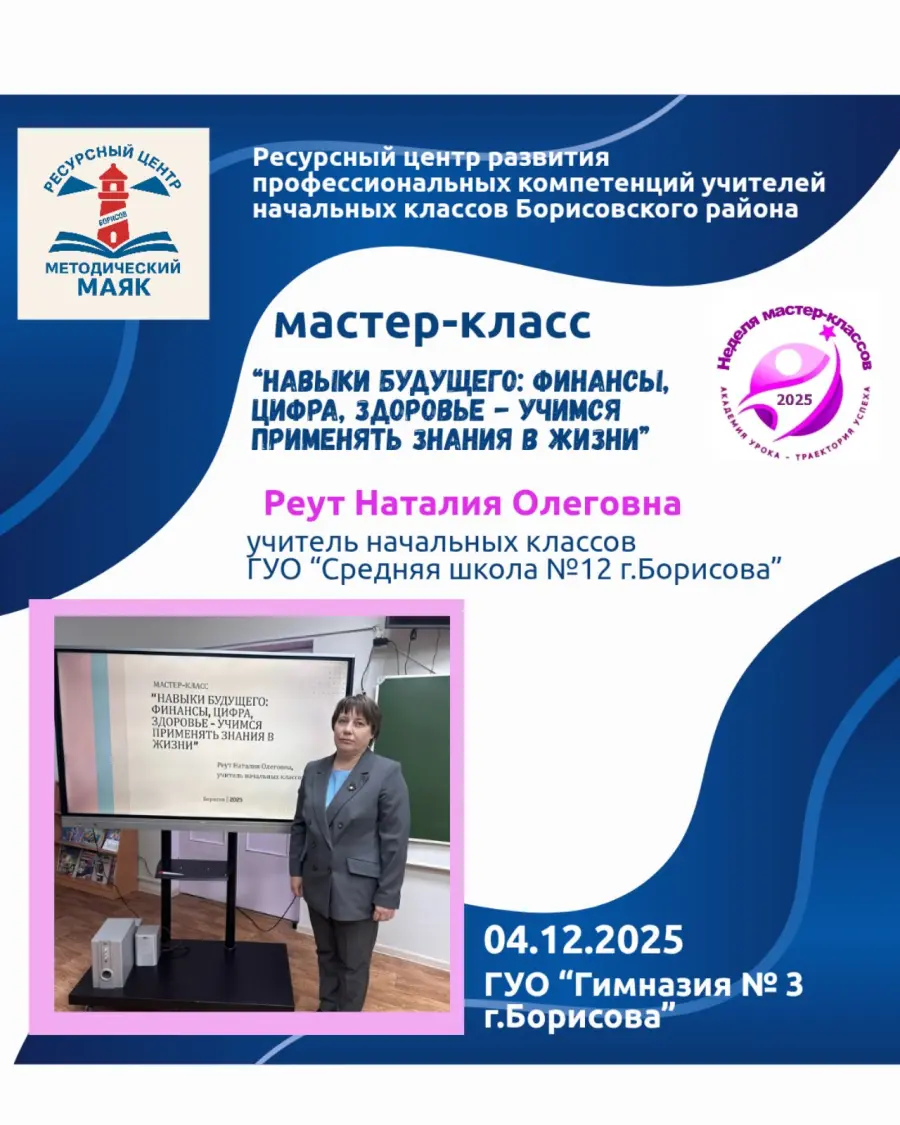 ● Наталия Олеговна Реут (СШ №12) — «Навыки будущего: финансы, цифра, здоровье — учимся применять знания в жизни». Мастер-класс показал, как формировать у младших школьников практические компетенции, необходимые в современном мире.