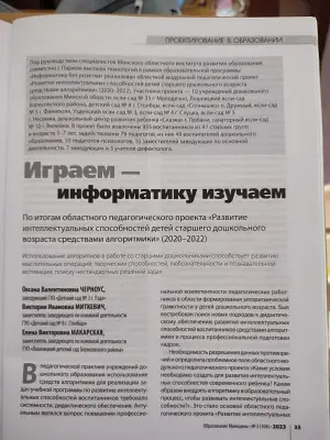 О реализации областного модульного педагогического проекта "Развитие интеллектуальных способностей детей старшего дошкольного возраста средствам алгоритмики" (2020-2022) в ГУО "Лошницкий детский сад Борисовского района" можно узнать в материале "Играем - информатику изучаем" заместителя заведующего по основной деятельности данного учреждения Макарской Елены Викторовны и ее коллег.