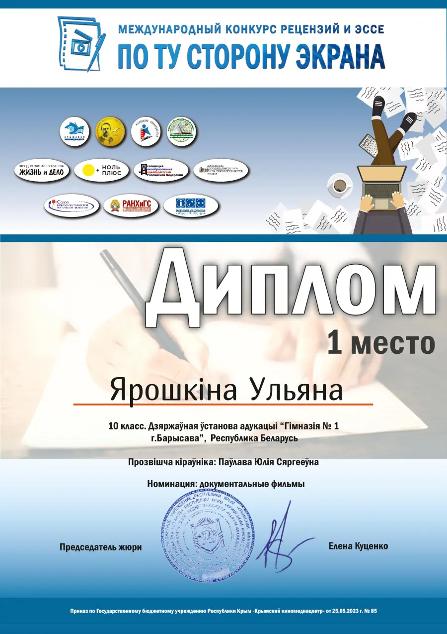 Всего в конкурсе участвовало более 200 работ. Нужно было написать эссе или рецензию на предложенный художественный или документальный фильм. Ученица гимназии Ульяна Ерошкина под руководством учителя белорусского языка и литературы Юлии Сергеевны Павловой на суд жюри представили эссе на научно-популярный фильм «Наша планета. Пресная вода» на белорусском языке под названием «Вада – жыццёвы сасуд». Жюри высоко оценило данную работу и присудило Ульяне 1 место в своей возрастной категории.