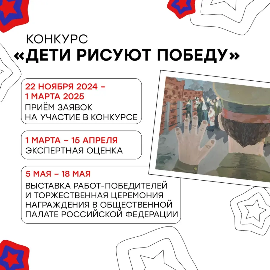 С 22 ноября 2024 года по 31 марта 2025 года в преддверии 80-летия со Дня Победы в Великой Отечественной войне автономная некоммерческая организация по развитию социальной активности и социальных коммуникаций "Агентство социальных технологий и коммуникаций" проводит конкурс по изобразительному и декоративному искусству "Дети рисуют Победу".