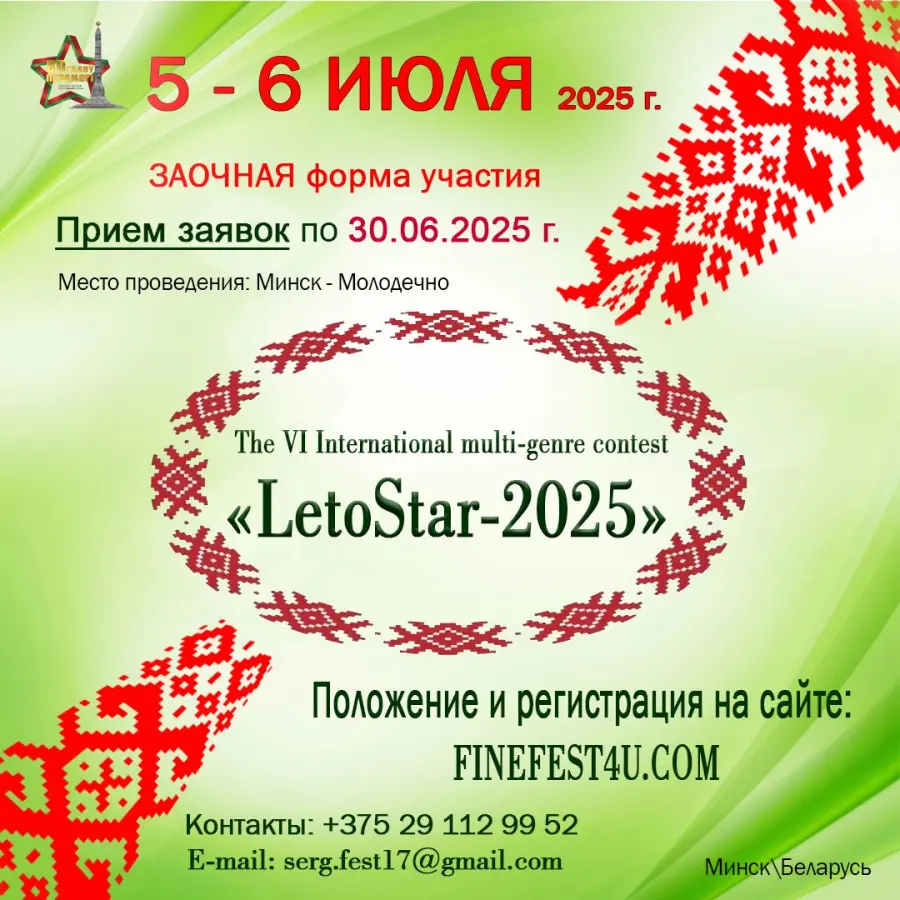 С 5 по 7 июля 2025 года дистанционно пройдёт "LETO STAR-2025". Конкурс приурочен к 80-летию Победы советского народа в Великой Отечественной войне.