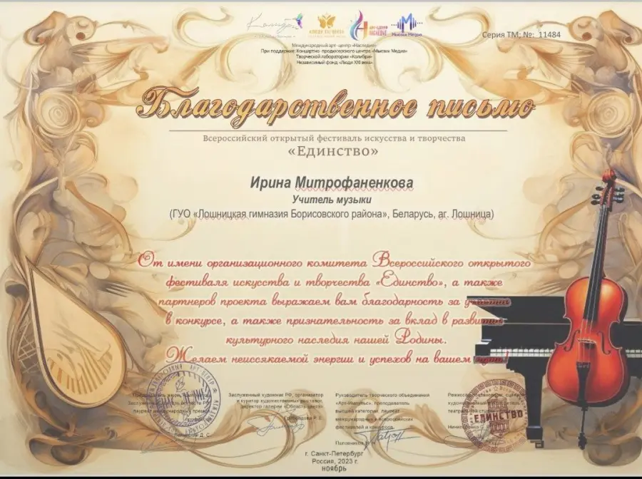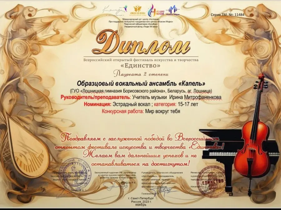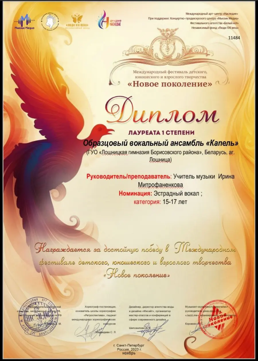 Образцовый вокальный ансамбль "Капель" под руководством учителя музыки ГУО "Лошницкая гимназия Борисовского района" Ирины Арсентьевны Митрофаненковой покорил жюри сразу двух международных конкурсов, которые в ноябре проходили в г. Санкт-Петербург в заочном формате.