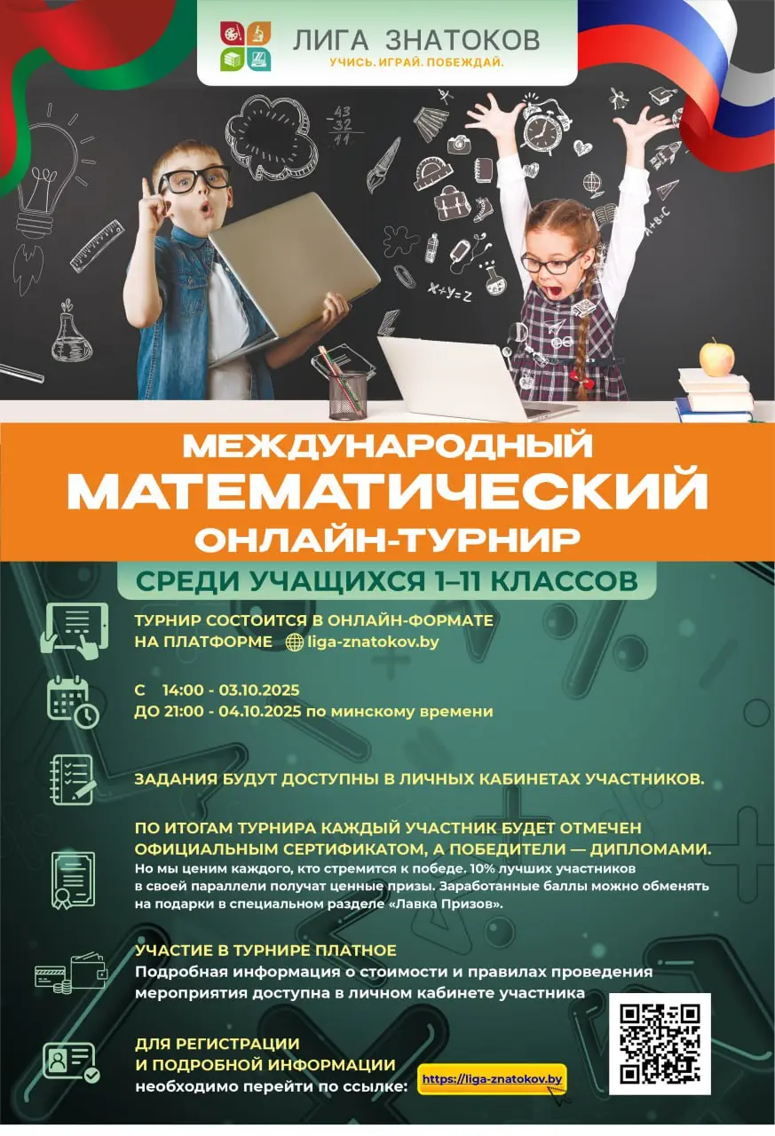 ООО "Лига Знатоков" приглашает учащихся I–XI классов учреждений общего среднего образования принять участие в Международном математическом онлайн-турнире, который состоится в период с 03 по 04 октября 2025 года.