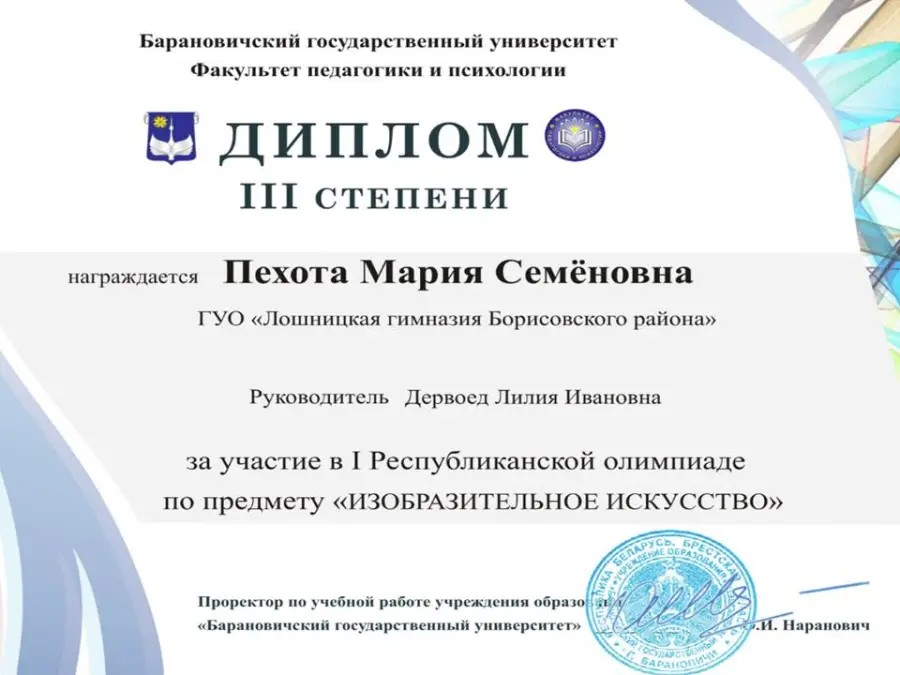 Диплом 3 степени - Пехота Мария Семеновна (учитель Дервоед Лилия Ивановна), ГУО "Лошницкая гимназия Борисовского района"