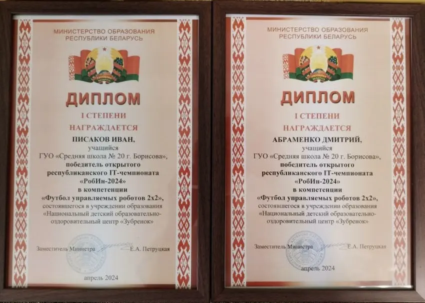 В компетенции «Футбол управляемых роботов 2х2» дипломами Министерства образования I степени награждены Писаков Иван, Абраменко Дмитрий, учащиеся ГУО «Средняя школа № 20 г. Борисова» (педагог Жибуля Даниил Александрович).