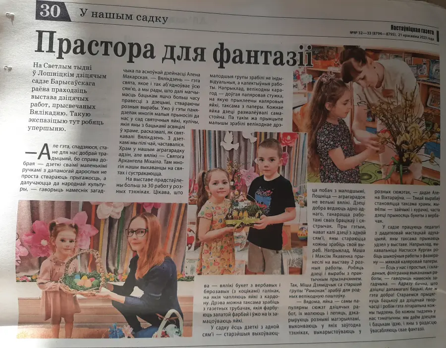 Заметка "Прастора для фантазіі" повествует о выставке детских творческих работ, посвященных Пасхе, которая была организована в Лошницком детском саду Борисовского района.