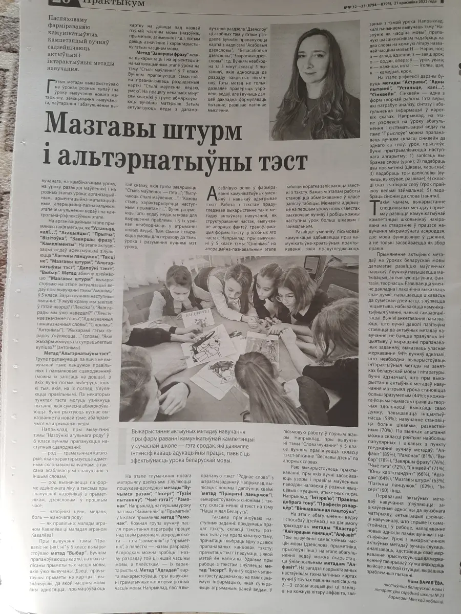 А учитель белорусского языка и литературы высшей квалификационной категории ГУО "Средняя школа № 23 г.Борисова" Воробьева Нонна Владимировна в статье "Мазгавы штурм і альтэрнатыўны тэкст" рассказывает о своем опыте работы по формированию у учащихся коммуникативных компетенций .
