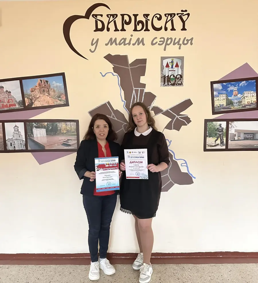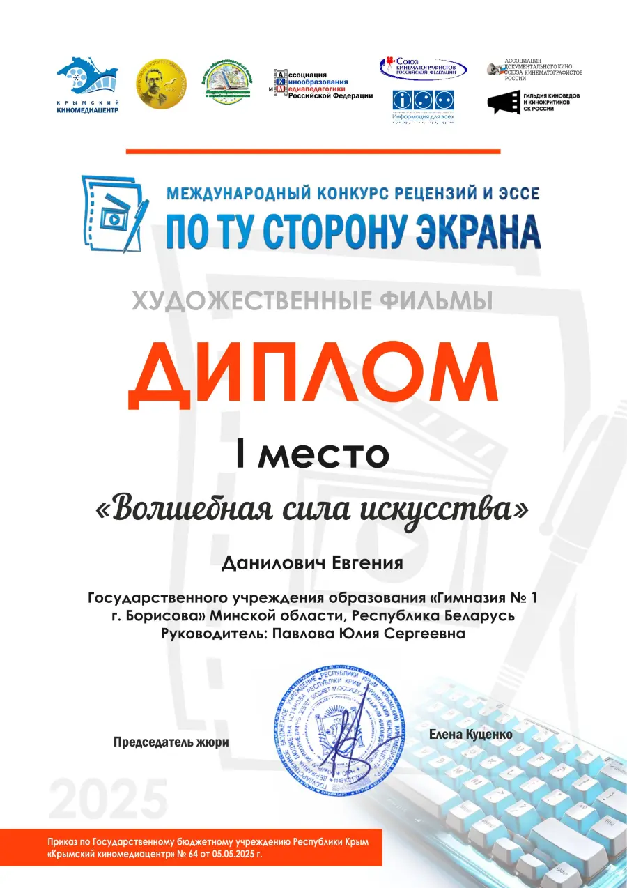 На днях были подведены итоги XІI Международного Конкурса эссе и рецензий на заданный фильм "По ту сторону экрана". Уже не первый раз учитель белорусского языка и литературы ГУО "Гимназия №1 г.Борисова" Павлова Юлия Сергеевна вместе со своими учениками успешно принимают в нём участие. В этом году работа ученицы 10 "В" класса Данилович Евгении удостоена диплома 1 степени, а преподавателю от организаторов конкурса объявлена благодарность.