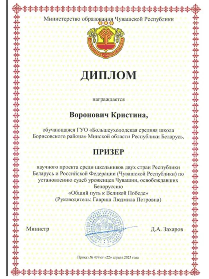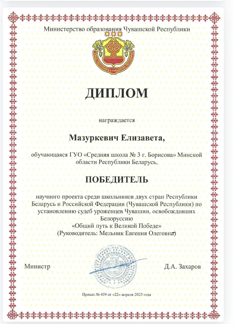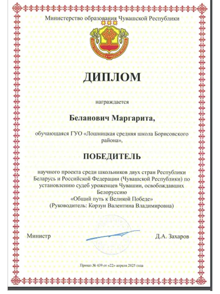 В апреле – мае 2025 года подведены итоги Международного конкурса научно-исследовательских работ "Общий путь к Великой Победе", исследования исторических знаний о событиях времен Великой Отечественной войны 1941-1945гг., о судьбах уроженцев Чувашской Республики, сражавшихся за освобождение Беларуси.