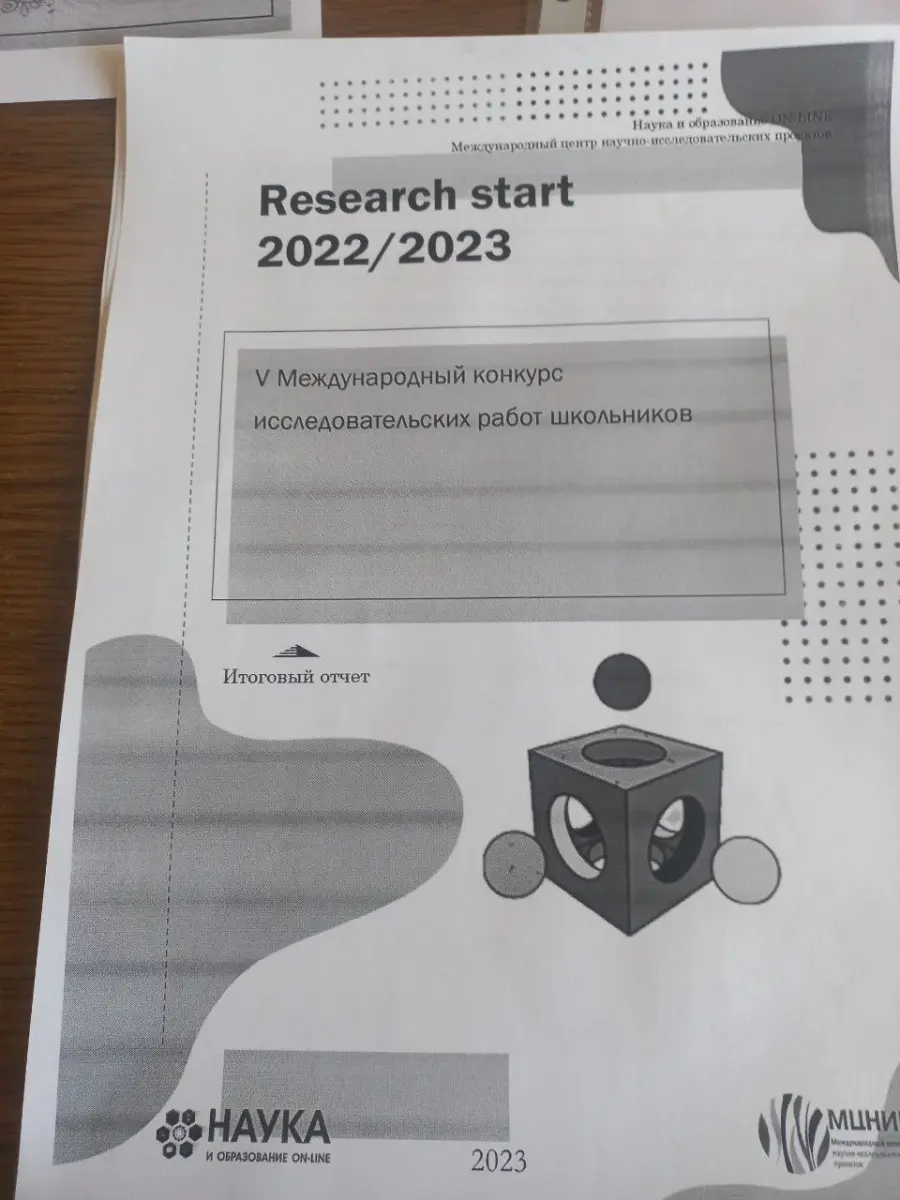 В течение 2022/2023 учебного года проводился V Международный конкурс исследовательских работ школьников "Research start" 2022/2023. Организаторы конкурса: Наука и образование ON-LINE (Сетевое издание зарегистрировано Роскомнадзором, свидетельство ЭЛ № ФС 77 – 70153 от 30.06.2017 Сетевой адрес: https://eee-science.ru Международный центр научно-исследовательских проектов (Лицензия на осуществление образовательной деятельности №1686 от 01.11.2019.)