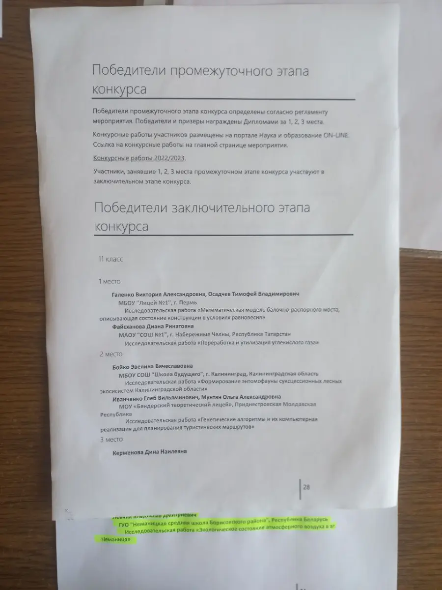 Левчик Владислав Дмитриевич, учащийся 7 класса ГУО "Неманицкая средняя школа Борисовского района" удостоен Диплома 3 степени с исследовательской работой «Экологическое состояние атмосферного воздуха в аг. Неманица».