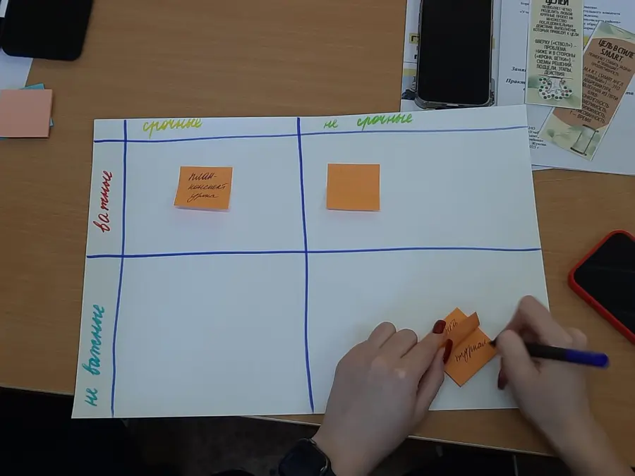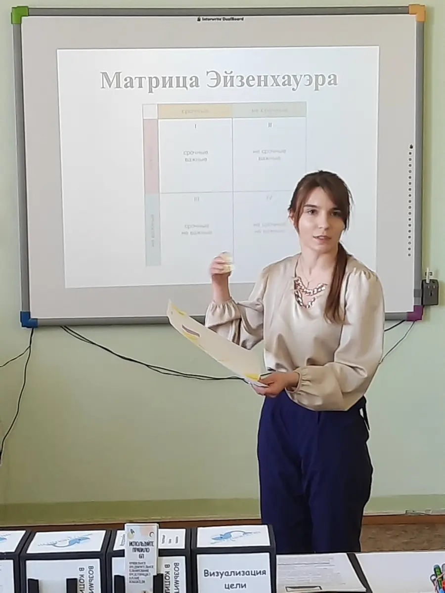 Учителем информатики Музыченко Е.О. был представлен второй кит тайм-менеджмента - «Планирование». Молодые педагоги узнали что такое 6 П, карманы времени, зачем нужно «Съесть лягушку на завтрак», вкусный ли «Бифштекс из слона» и что такое метод Pomodoro. Молодые коллеги убедились, что в жизни, как и в профессиональной деятельности, важно научиться сортировать свои дела по срочности и важности и составили матрицу Эйзенхауэра.