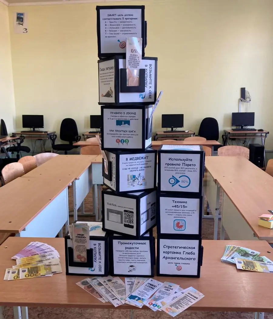 Все мероприятие состояло из нескольких блоков: целеполагание, планирование, самомотивация. Связующим звеном был прием «Тематический куб». В работе были использованы 10 тематических кубов, грани которых обозначали техники и методы управления временем для достижения максимально положительного результата. На одной из граней был предусмотрен карман «Возьми в свою копилку», из которого молодые педагоги могли забрать себе понравившиеся закладки, а также QR - коды приложений для дальнейшего использования.