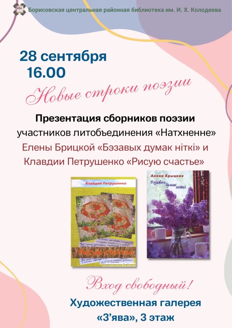 28 сентября 2023 года в художественной галерее "З'ява" ГУК "Борисовская центральная районная библиотека имени И.Х.Колодеева" состоится вечер поэзии.