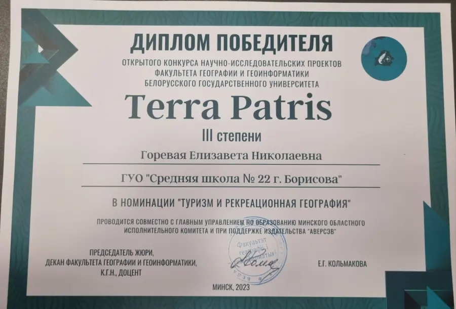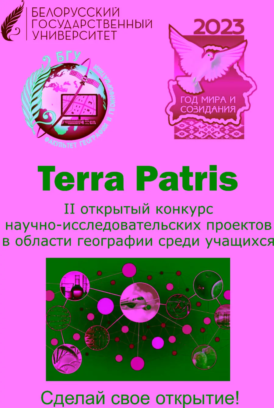 Конкурс "Terra Patris", который нацелен на популяризацию научных исследований среди школьников в области географии, проводится Белорусским государственным университетом совместно с Главным управлением по образованию Минского областного исполнительного комитета и посвящен Году мира и созидания.