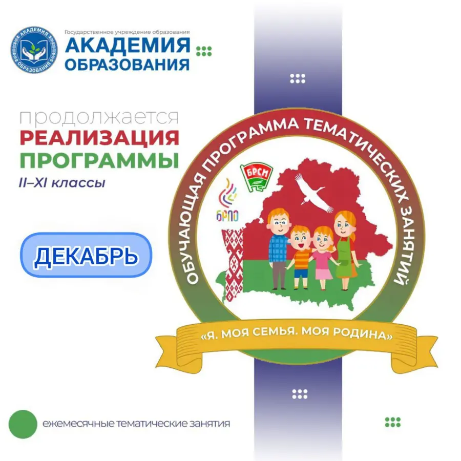 С 15 по 19 декабря во 2–11-х классах учреждений общего среднего образования пройдут очередные тематические занятия по программе "Я. Моя семья. Моя Родина".