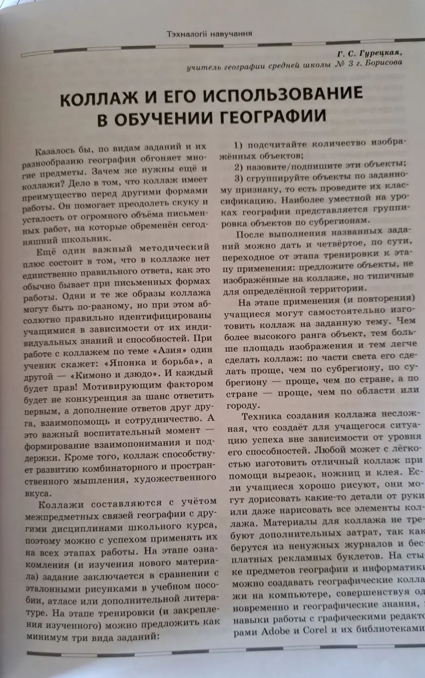 В журнале опубликован материал учителя географии ГУО "Средняя школа № 3 г.Борисова" Г.С.Гурецкой "Коллаж и его использование в обучении географии"