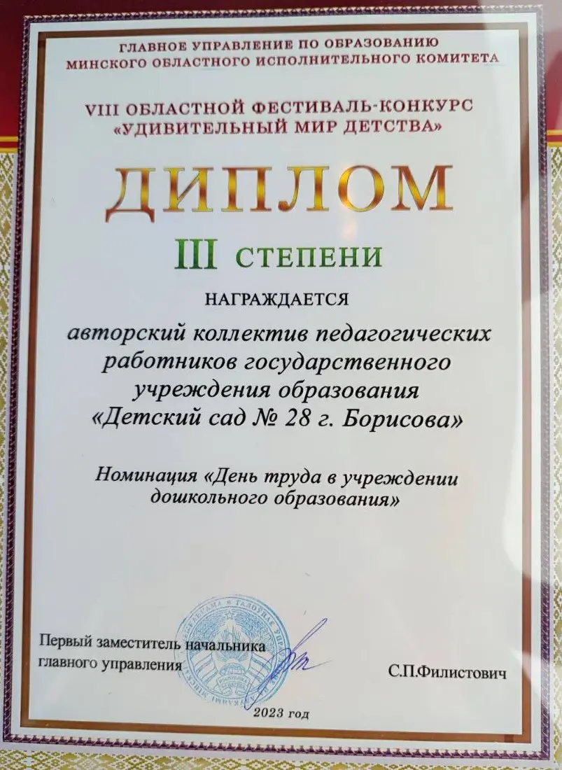 Дилома 3 степени удостоен творческий коллектив ГУО "Детский сад № 28 г.Борисова"