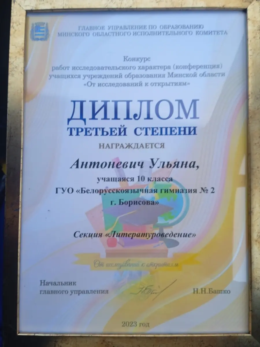 8 Литературоведение (русская литература) Антоневич Ульяна, ГУО «Белорусскоязычная гимназия № 2 г. Борисова», - Диплом 3 степени