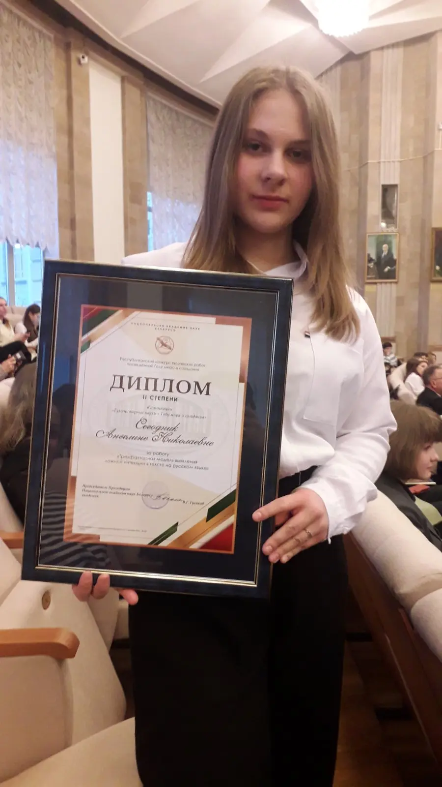 Диплом финалиста - Чижонок Виктория Сергеевна, учащаяся 11 класса ГУО «Лошницкая гимназия Борисовского района», за работу «Мастацкія асаблівасці казак Алены Масла (на прыкладзе зборніка “Таямніца закінутай хаты”)»;