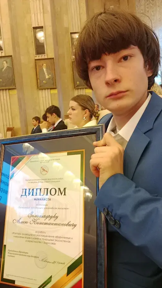Диплом финалиста- Земоглядчук Алесь Константинович, учащийся ГУО «Средняя школа № 13 г. Борисова», за работу «Факторы, влияющие на распределение аборигенных и инвазивных видов слизней в природных экосистемах в окрестностях г. Борисова»;