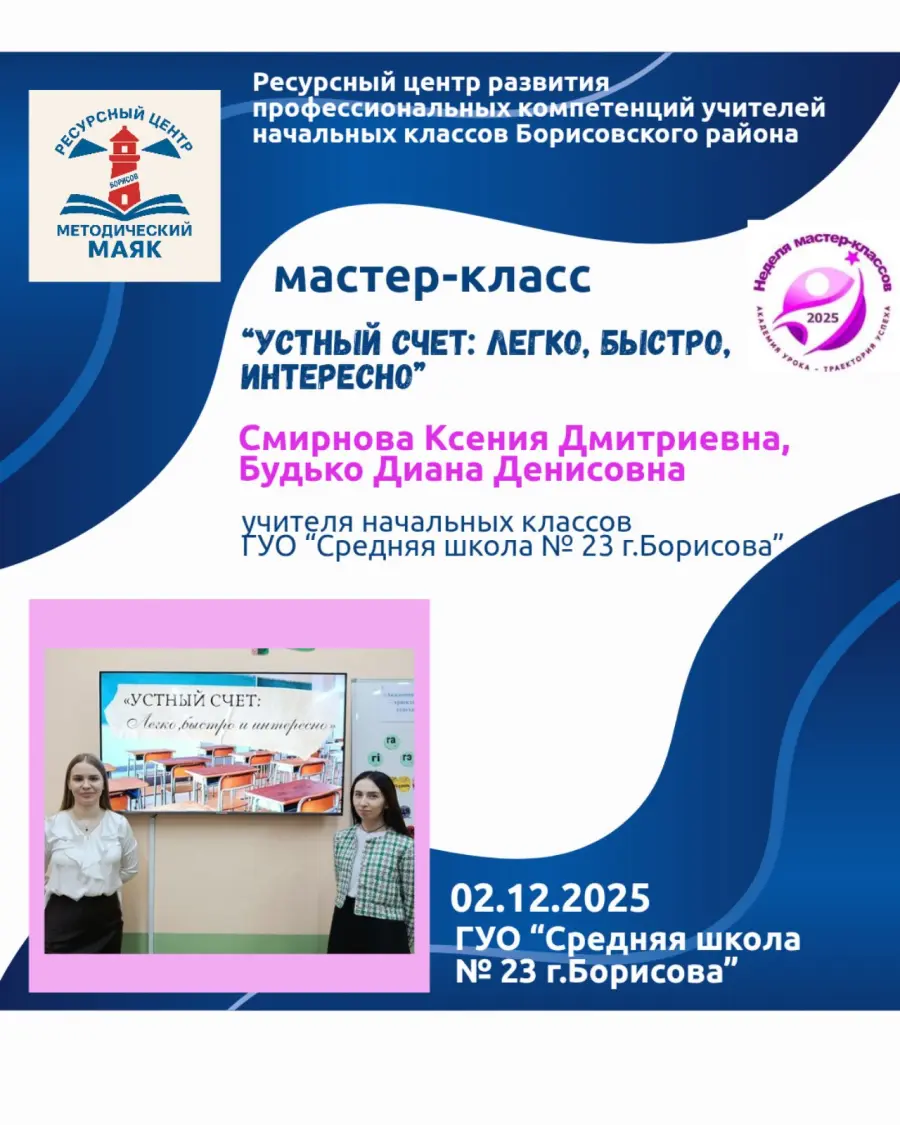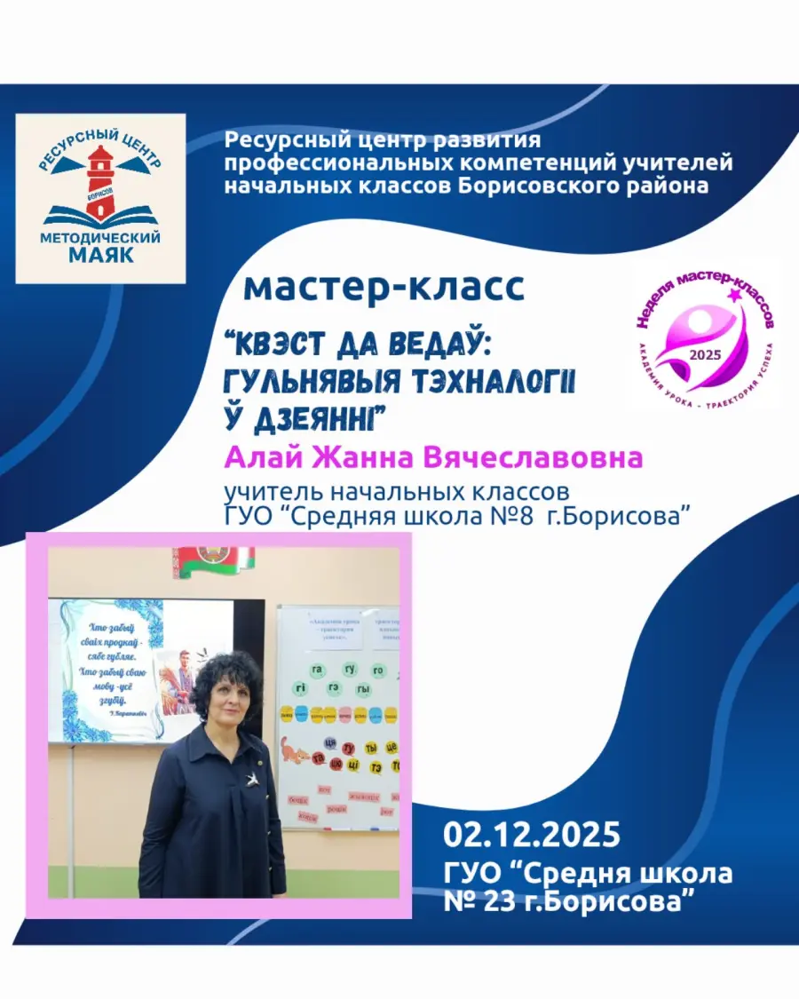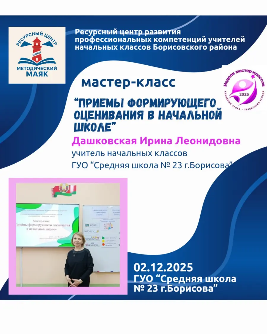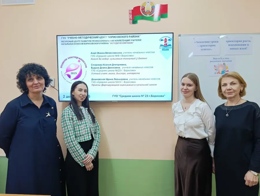 2 декабря методическая неделя мастер-классов для учителей начальной школы продолжилась в ГУО "Средняя школа №23 г. Борисова". Этот день стал настоящей лабораторией идей: педагоги делились практическими находками, показывали игровые технологии и обсуждали, как сделать обучение увлекательным и доступным для каждого ребёнка.