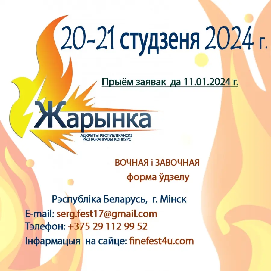 20-21 января 2024 года пройдет II Открытый Республиканский разножанровый конкурс "ЖАРЫНКА-2024" на сцене Дворца культуры Железнодорожников, по адресу: г.Минск, ул. Чкалова,7. Конкурс, главной целью которого является содействие культурного роста, патриотического воспитания, выявление талантливых детей и молодежи,поддержка детского и юношеского творчества. В конкурсе могут принять участие все желающие, которые хотят состязаться в очной или заочной форме проекта.
